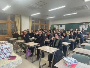 昼間には、懐かしの母校に約30名が集まり、校内見学ツアーを行いました。久しぶりに教室の座席に腰を下ろし、しばし高校生時代に戻ったかのような気持ちで当時を懐かしく思い出しました。また、かつてプールだった場所が、美しい洋風の中庭へと姿を変えていたことに驚かされ、記念写真をみんなでパシャリ!