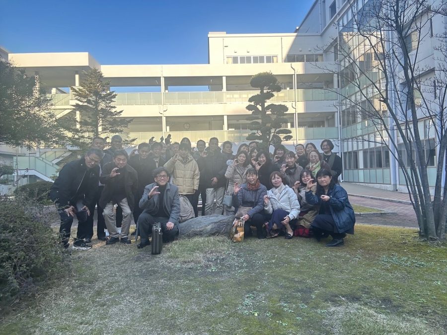 昼間には、懐かしの母校に約30名が集まり、校内見学ツアーを行いました。久しぶりに教室の座席に腰を下ろし、しばし高校生時代に戻ったかのような気持ちで当時を懐かしく思い出しました。また、かつてプールだった場所が、美しい洋風の中庭へと姿を変えていたことに驚かされ、記念写真をみんなでパシャリ!